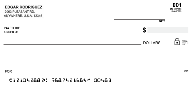Your personal information is printed here. Never list your social security number on your printed checks.